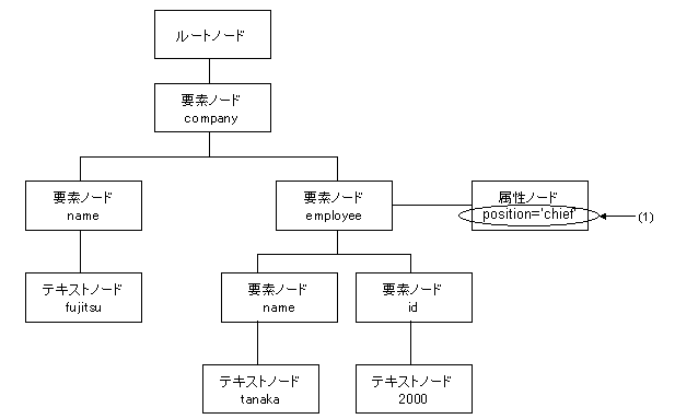 “employee要素ノード”の属性ノード“position”の値を示します。図中の(1)“chief”を指します。