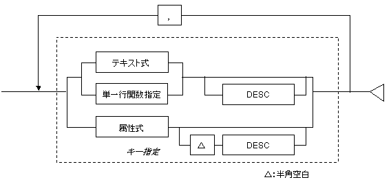 ソート式には、テキスト式、属性式または単一行関数指定が指定できます。それぞれに対して取出し順序(昇順または降順)を指定できます。“,”で区切って複数指定することができます。