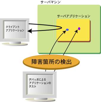 サーバアプリケーションのテストを行う場合、実際にクライアントアプリケーションと結合して行います。このとき、サーバアプリケーションをデバッガ配下で動作させることで、サーバアプリケーションが正しく作成されているか確認できます。