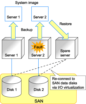 When a primary server fails, a system image (that must be backed up beforehand) will be restored to the spare server, and the spare server will be started up. Note that one or more spare servers can be shared by one or more primary servers.