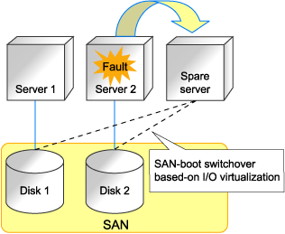 For spare server configurations based on I/O virtualization, one or more spare servers can be shared by multiple physical OS's and VM guests (using the high-availability feature provided with their server virtualization software). For details on the server virtualization products supporting this configuration, refer to "A.1 Supported Functions".