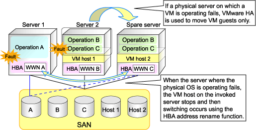 In this case, spare servers should be set up as a VM hosts booting from a SAN, so that when a physical server hosting VM guests experiences a failure, the high-availability feature provided with their virtualization software can be used to transfer the VM guests to this spare VM host.