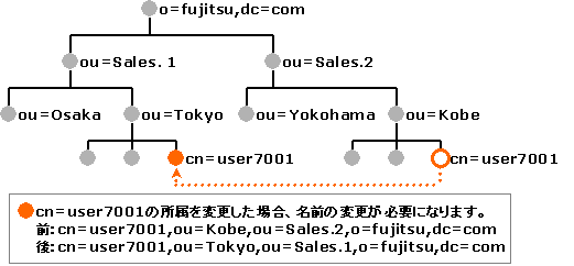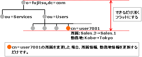 なお、エントリをLDIFファイルに出力して保守作業を行う予定がある場合は、1つのツリー配下のエントリ数が、1〜10万件程度になるようにツリーの階層構造を分割し、複数のLDIFファイルに分割して出力できるように設計することを推奨します。