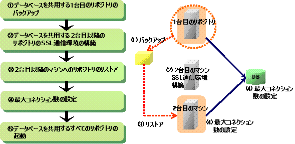 ここでは、データベース、およびデータベースを共用する1台目のマシンのリポジトリは、事前に構築されているものとして説明します。データベース、および1台目のマシンのリポジトリを作成していない場合は、“環境構築の流れ”の“データベース共用形態で運用する”の手順に従って作成してください。