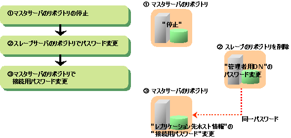 スレーブ運用のリポジトリで管理者用DNのパスワードを新しいものに変更した場合は、マスタ運用のリポジトリの[レプリケーション先ホスト情報]の[接続用パスワード]に、新しいパスワードを設定する必要があります。