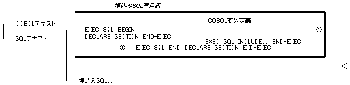 SQL埋込みCOBOLプログラムは、COBOLテキストおよびSQLテキストからなるコンパイル単位とします。COBOLテキストは、COBOL97、PowerCOBOL97またはNetCOBOLの文法規則に準拠します。SQLテキストは、1つ以上の省略可能な埋込みSQL宣言節と、1つ以上の埋込みSQL文から構成されます。