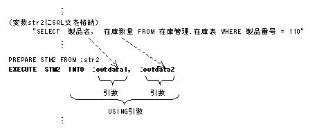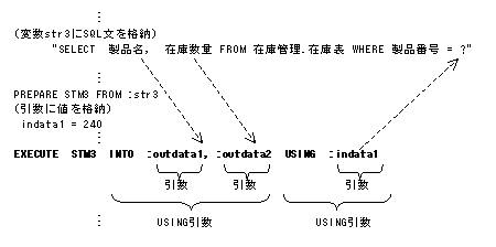 アプリケーションの作成時に、被準備文の動的パラメタ指定の値の属性や個数、または取り出す選択リストの属性や個数がわかっている場合は、SQLDA構造体またはSQL記述子域を使用しなくても、USING引数を使用して値の設定や実行結果の取り出しを行うことができます。