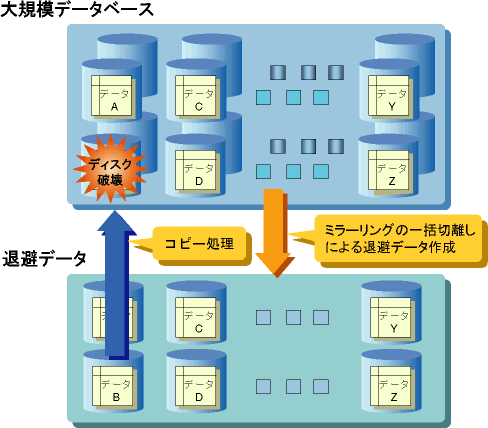 このようなシステムにAdvanced Backup Controllerを適用すると、バックアップ所要時間を大幅に短縮できます。また、バックアップ所要時間が短くなることにより、業務範囲全体を一括してバックアップする運用が実現可能になり、バックアップ運用を単純化することができます。当然この場合においても、Symfowareが従来から持つ、メディアリカバリの局所化技術によって媒体障害が発生した時には、他の正常な媒体を利用中の業務に影響を与えずに高速なメディアリカバリを実現できます。