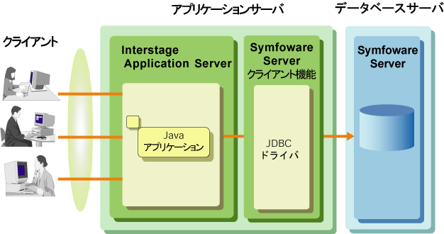 JDBC APIを使用して作成されたJavaアプリケーションから、JDBCドライバを利用して、データベースにアクセスすることができます。フレームワークとして、J2EEを利用することもできます。