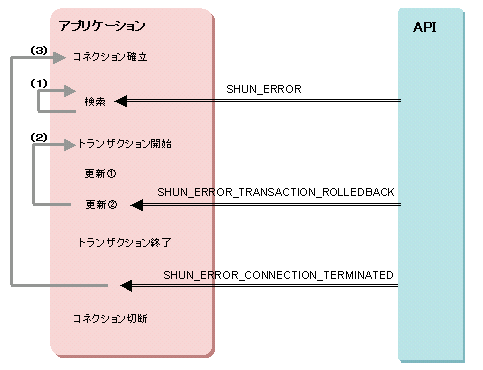 SHUN_ERROR_TRANSACTION_ROLLEDBACK(注1)が返却されます。この場合、トランザクションを開始した位置(注2)から再実行します。