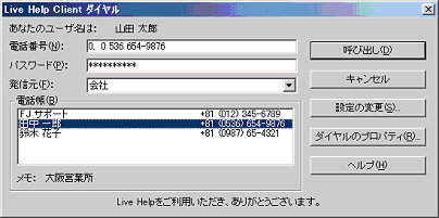 電話番号とパスワード(必要がある場合)を入力したら、エキスパートのコンピュータに接続するために[呼び出し]ボタンをクリックしてください。接続をしないで[Live Help Client]プログラムを終了させるには、[キャンセル]ボタンをクリックしてください。