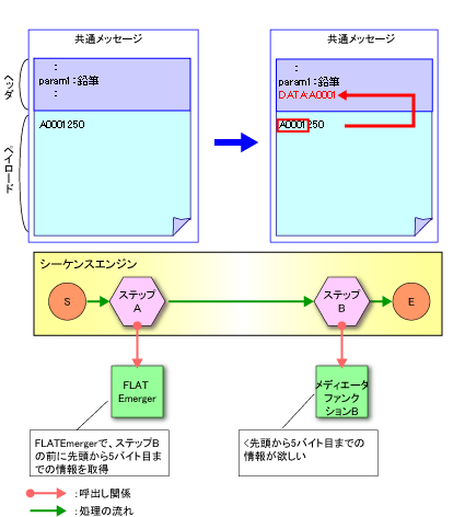 共通メッセージからの情報取得する方法には、以下の種類があります。メディエータファンクションのパラメタに、ペイロードの一部の値を設定したい場合は、事前に共通メッセージからの情報取得を利用して、取り出した値を共通メッセージのヘッダパラメタに格納しておきます。