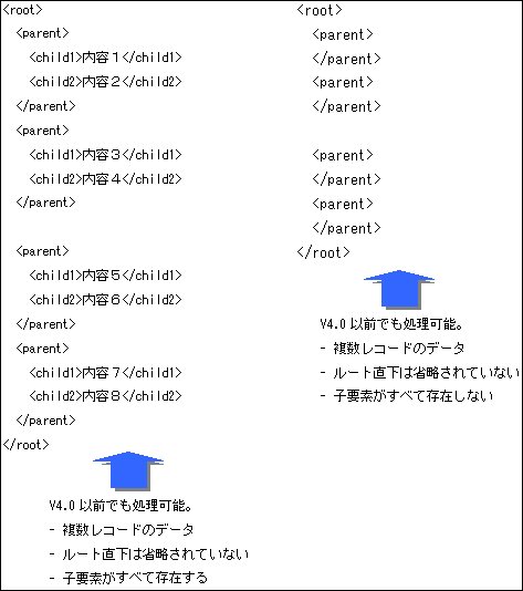 しかし、以下の条件を満たしている場合に限り、複数レコードを含むXML文書も入力データとすることができます。