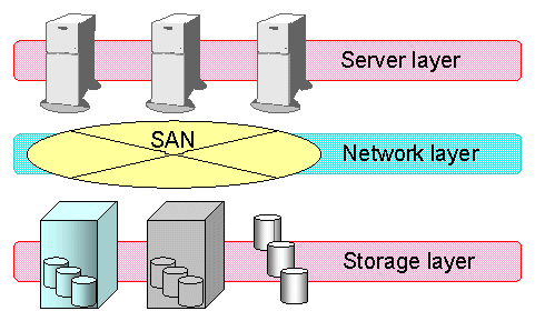 In a Storage Area Network (SAN) environment, the Virtual Storage function is provided through the following three layers.