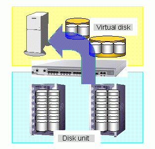 It is now common practice to estimate the data size recognized by the transaction server to recognize, use, and create its volume, and accordingly allocate a logical unit (LUN) from the disk unit. VSC provides a virtual disk function that allows you to create a volume of a size independent of the logical unit (LUN) size. In other words, this function weakens the physical relationship between a transaction server and disk unit, and makes it possible to provide a volume of the desired size at the desired time for the transaction server.