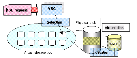 Then, VSC checks whether the target physical disk exists in the specified virtual storage pool and whether there is sufficient space for the required capacity before creating a virtual disk. Since the user can only specify one physical disk, a virtual disk whose capacity exceeds that of the physical disk cannot be created.