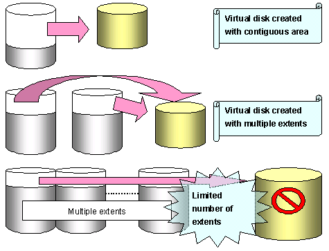 Note that there is a maximum limited number of extents that VSC can control for one virtual disk. If the physical area is fragmented by repeatedly creating and deleting virtual disks with various capacities during long-term system operation, creating a virtual disk with a required capacity may not be possible even when overall free space in the virtual storage pool is sufficient. In such case, register a new physical disk in the virtual storage pool in a way that the free space will not be fragmented.