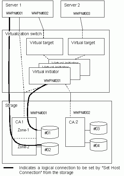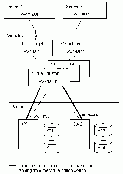 It is necessary to protect physical disks you want to have virtualized by making them only accessible from Virtual Storage Conductor, so that the transaction server cannot directly access the disks. Thus, you should set zoning between the virtualization switch and storage (channel adapter).