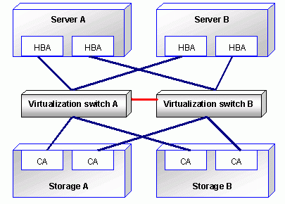 Be sure to use redundant configurations when designing the virtualization switches that connect disk devices and transaction servers, in order to ensure the reliability of access paths.