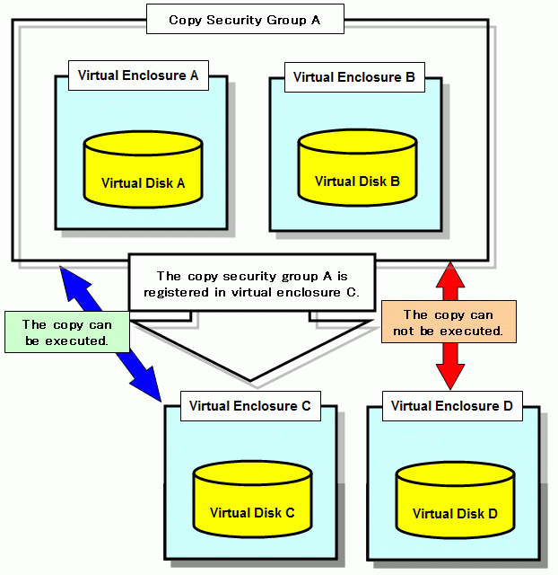 However, copies cannot be made between Virtual Disk A and Virtual Disk B (which are in Virtual Enclosure A and Virtual Enclosure B respectively, which are both registered in Copy Security Group A)" and Virtual Disk D in Virtual Enclosure D.