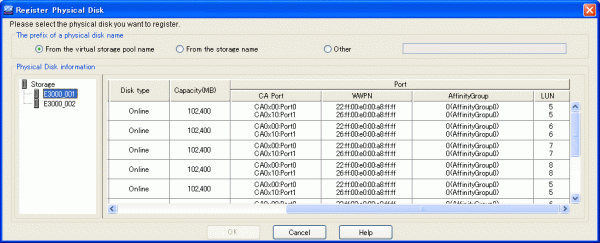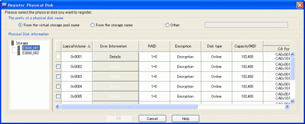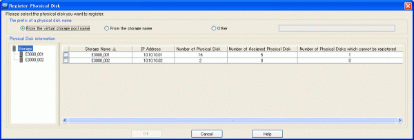 Select a storage name (or storage names) from the table and click the <OK> button. You cannot select a storage name if none of the physical disks in the storage device can be registered.