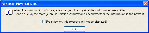 The following confirmation dialog box opens when [Register Physical Disk] is selected.