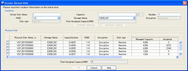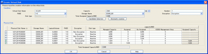 The user can create a virtual disk while checking information of the physical disk selected automatically based on the status information entered as described below.