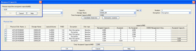 Enter the capacity assigned from the physical disk selected to the virtual disk in [MB]. Note that checking the physical disk sets non-assigned capacity as the quota capacity. Removing the check mark from the physical disk sets the quota capacity to 0.