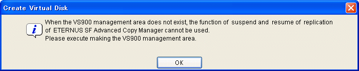 Before creating a virtual disk, check the "VS900 Management Area (Create)" dialog box and confirm that a VS900 management area has been allocated.
