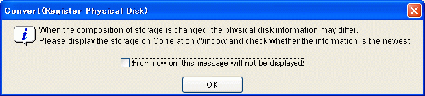 Before registering the disk, display the related management window of the disk unit and confirm that the disk unit information has been updated. Select physical disk registration. The following confirmation dialog box appears.