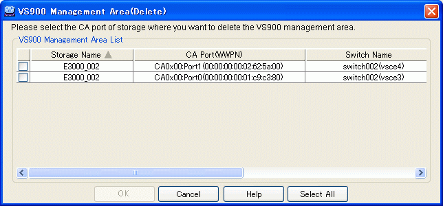 The VS900 management area list then appears. Select the VS900 management area (or management areas) you want to delete and click the <OK> button.