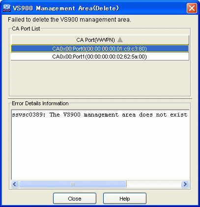 When the VS900 management areas were not deleted successfully, the "VS900 Management Area (Delete)" error dialog box is displayed. The detailed error information for the VS900 management area that failed to be deleted can be referenced by selecting the CA port displayed. Confirm the cause of the failure to delete the VS900 management area, then click the <Close> button.