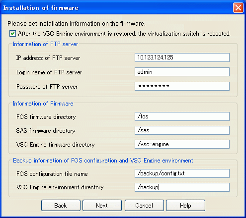 In the " Installation of firmware " dialog box, enter the fields as described below. If you want to select a firmware installation pattern again, then click <Back>.
