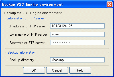 This section describes how to back up the VSC Engine environment settings to the specified FTP server.