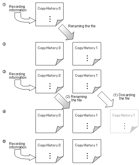 Two copy log files are retained: The current-generation file (to which information is being written) and the previous-generation file. Both files can be distinguished by the suffix. Suffix ".0" denotes the copy log file to which a copy log is written. When the file size of the current copy log file exceeds the limit value, the file is switched to a new copy log file. The "Figure 6.2 Switching copy log files" shows how copy log files are switched.