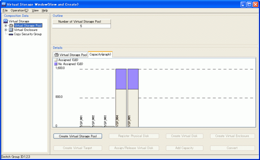 The following describes the capacity (graph) window displayed when you select the Virtual Storage Pool (root).