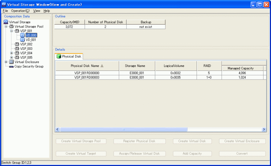The following describes the window displayed when you select the virtual disk name under the Virtual Storage Pool in the Composition Data tree.