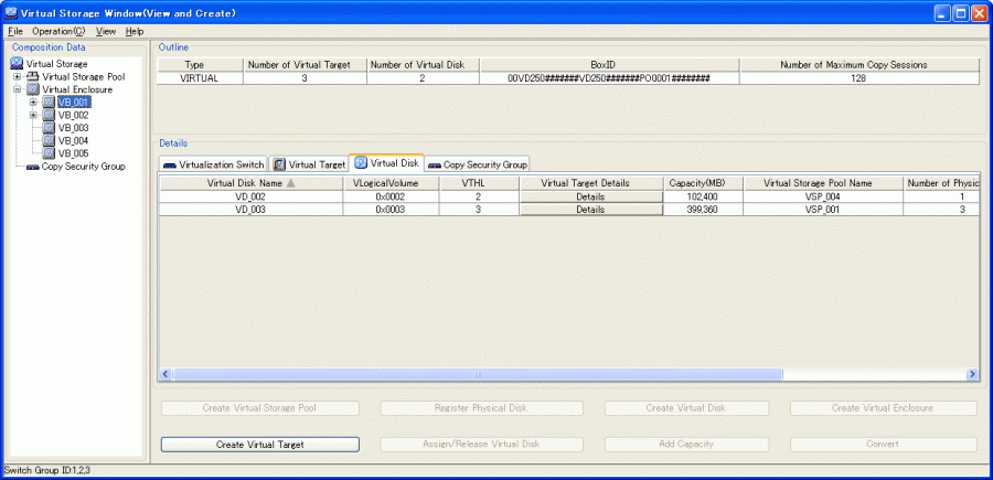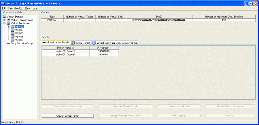Switch Name | Name of the virtualization switch registered to the virtual target For virtualization switches other than the VS900 Model 200, the switch device name is displayed as “virtualization switch name (host name)”. |