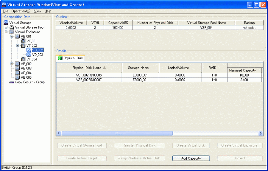 The following describes the window displayed when you select the virtual disk name under the Virtual Enclosure displayed in the Composition Data tree.
