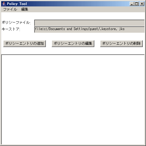 ただし、2回目以降のpolicytoolコマンドの起動でこのダイアログが表示される場合は、セキュリティポリシーファイルが指定された格納位置にあるかを確認してください。