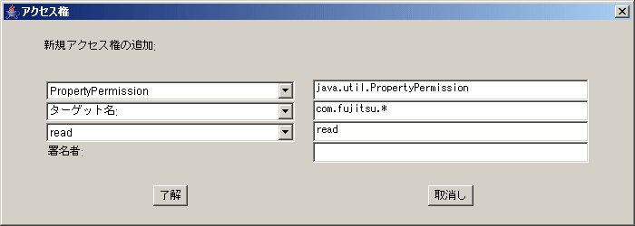 プロパティ権限 | PropertyPermission | com.fujitsu.* | read |