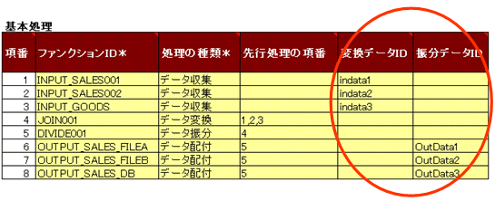 ファンクション処理で扱うデータの対応付けは、プロセス定義シートにおいて、「変換データID」および「振分データID」を前後のファンクションに対して指定することにより設計します。
