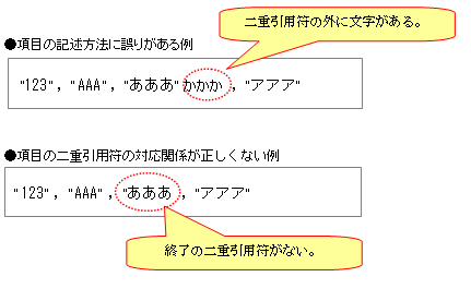 二重引用符で囲んだデータの場合、項目間はカンマ(,)以外の文字があるとエラーになります。区切り文字のカンマ(,)の前後の余分な文字は、削除してください。