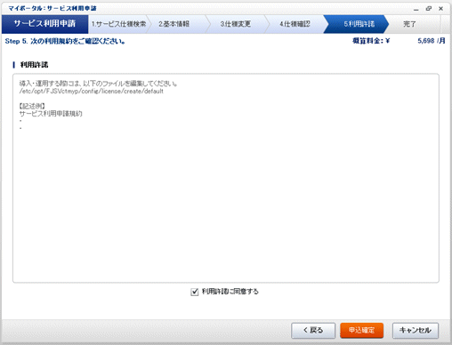 表示される利用許諾を確認し、[利用許諾に同意する]チェックボックスをチェックしてから、[申込確定]ボタンをクリックします。