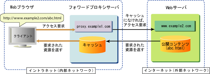 一般的に、本機能は、ファイアウォールで制限される内部ネットワークのクライアントから外部ネットワークのWebサーバへのアクセスを許可するために使用されます。また、プロキシサーバでは、Webサーバからのデータをキャッシュに保存できます。