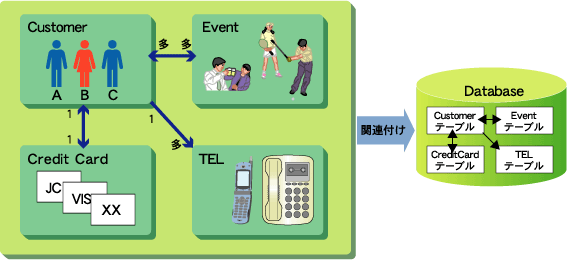 例えば2002/12/24(プライマリキー)のクリスマスパーティイベントにID(プライマリキー)が001であるCustomerが参加する場合、多:多の関係が更新され、Joinテープルが更新されます。