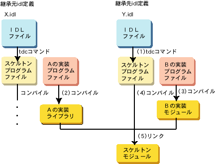 継承先のidl定義に継承元のidl定義をincludeする記述を追加します。tdcコマンドは、-Iオプションと共に、-updateオプションを設定して実行してください。tdcコマンドの詳細については、“リファレンスマニュアル(コマンド編)”を参照してください。