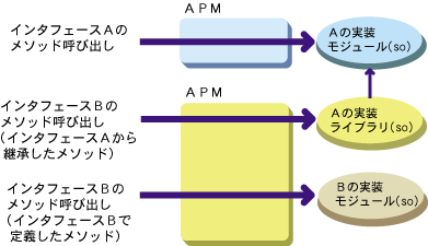 継承を使用する場合、モジュール作成時に継承元のインタフェースを実装しているライブラリをリンクします。継承を使用したアプリケーションの作成時に必要な注意点を、以下に示します。