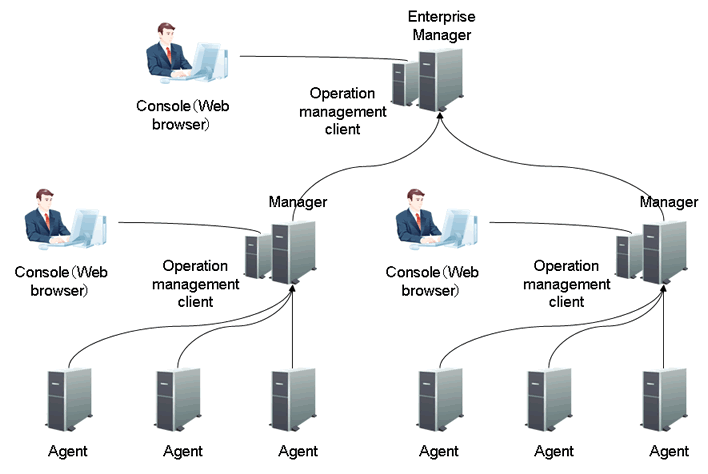 Centralized management of the entire system is normally performed from an operation management client connected to Enterprise Manager. However, it is also possible to manage each section from the operation management clients connected to the Managers while managing the entire system from the operation management client connected to the Enterprise Manage. To do this, parameters must be specified with the two-tier Manager setup command when the environment is created.