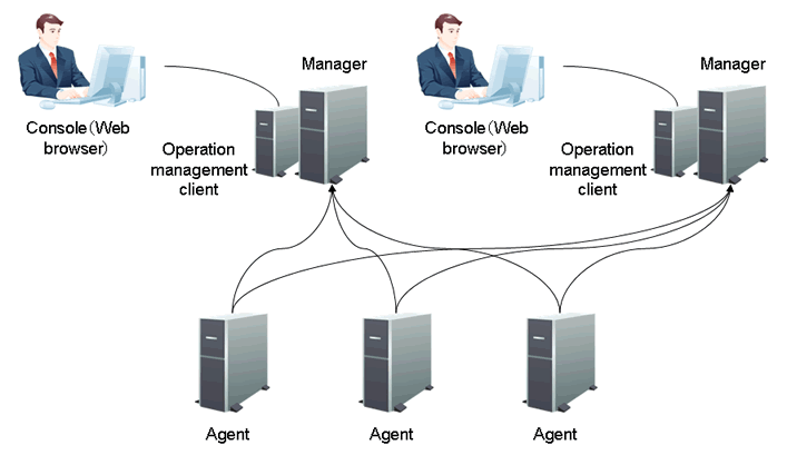 Even if one Manager cannot be used due to a network fault, etc., this system permits the Manager connected to a functioning network to take over management operations. This differs from the redundancy that is achieved using a cluster system.
